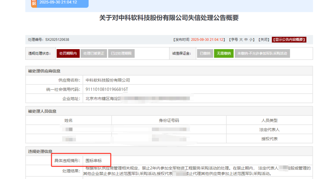 近日,某系统采购网发布《关于对中科软科技股份有限公司失信处理公告》,中科软因围标串标被处罚,具体是什么情况?