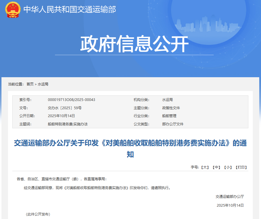 交通运输部14日发布《对美船舶收取船舶特别港务费实施办法》。《办法》共十条,自发布之日起施行,主要包括制定依据、收取范围、收取标准、收取主体、缴费航次、缴费要求、信息核实、违规处理、动态调整、解释部门和施行时间等内容,进一步明确了由中国建造的船舶、仅进入中国船厂修理的空载船舶,以及其他经认定予以豁免的船舶免予缴纳的具体规定。