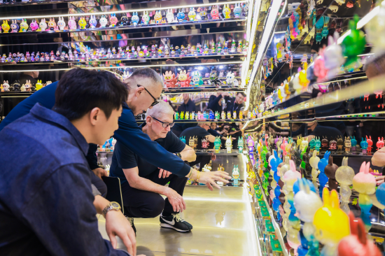 展览现场,泡泡玛特创始人王宁、LABUBU艺术家龙家升与库克进行了亲密互动,一起参观了LABUBU系列原创手稿和丰富多元的产品。