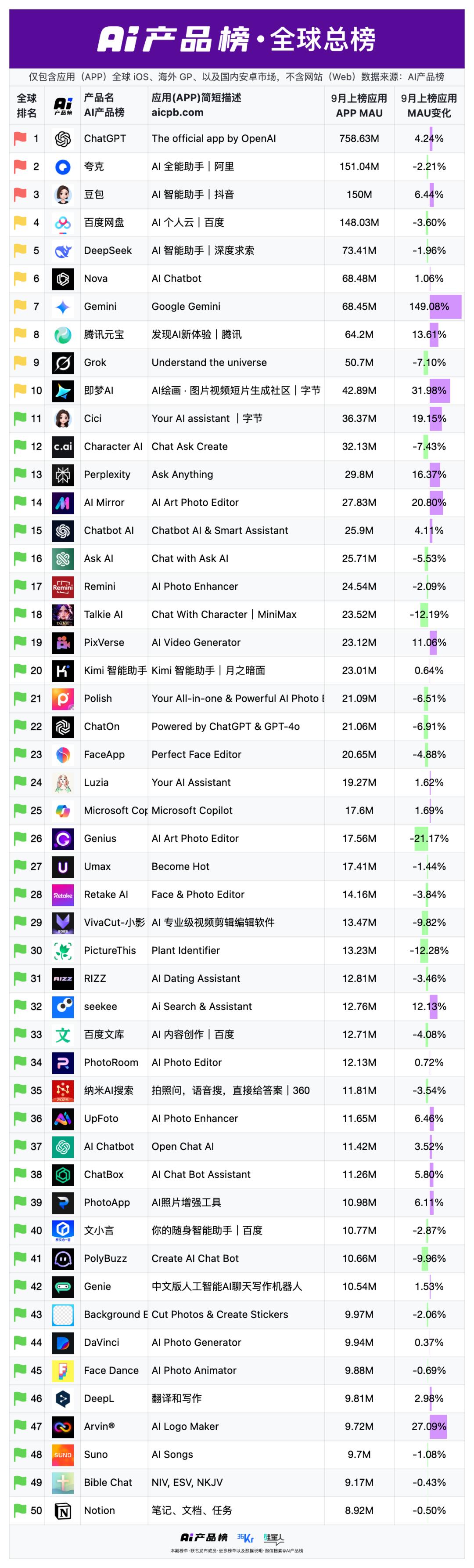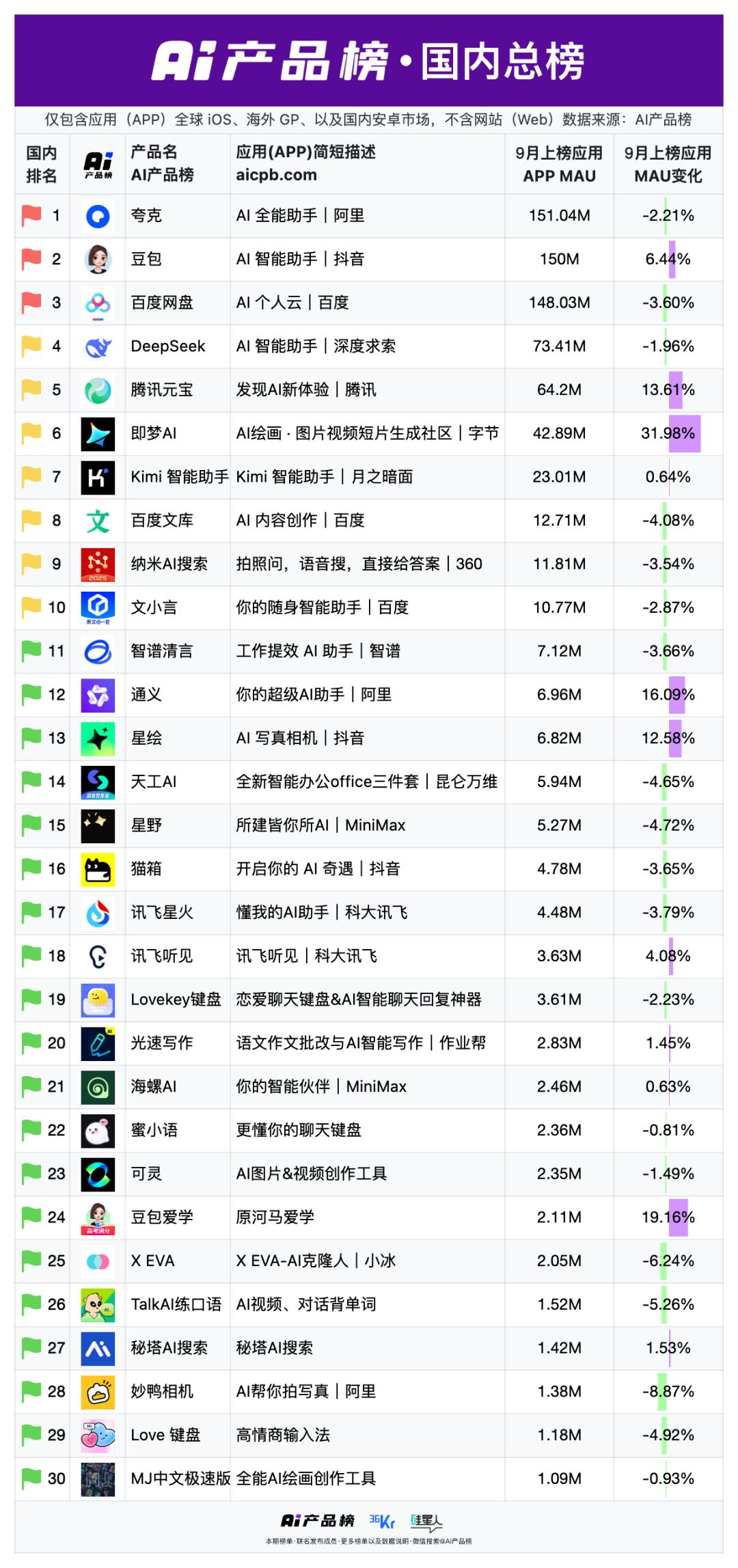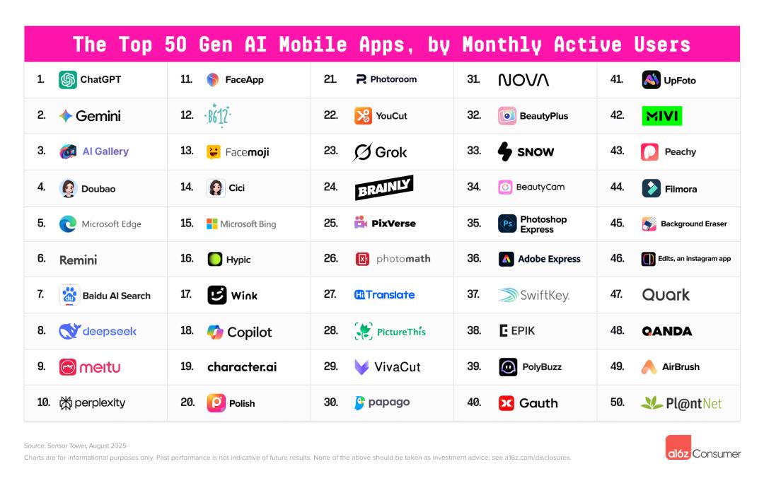 01中国AI应用的故事,仍然属于大厂种种迹象显示,中国AI产品的叙事正在彻底进入“大厂”时代。根据aicpb.com,国内AI应用Top20中,来自大厂(市值超过500亿元)应用有14个,占比高达70%。前三名毫无悬念:夸克、豆包、百度网盘。唯一闯进前十的创业公司,只有DeepSeek和Kimi。这个比例这一比例远高于海外。全球榜单上共有34个非中国产品,但只有5个属于“大厂”,占比只有15%,比如ChatGPT(OpenAI)、Gemini(Google)、Grok(X)、Character.AI(Google)和Microsoft Copilot。其他几乎全是Perplexity、PhotoRoom这样的小团队或创业公司。在国内头部AI产品里,大厂的身影几乎无处不在,字节、百度、阿里、讯飞这四家合计包揽了Top20榜单的大半壁江山。其中,上榜最多的大厂是字节,旗下4款产品跻身国内Top20,分别是豆包、即梦AI、星绘、猫箱。百度紧随字节之后,3个产品入围,分别是百度网盘、百度文库和文小言。排在第三位的是阿里,夸克和通义先后入榜。此外,老牌AI公司科大讯飞也有两个产品入榜,分别是讯飞星火和讯飞听见。为什么国内AI产品市场会出现大厂一边倒?一个很重要的原因是,资源的碾压。字节就是一个最典型的例子。2024年,当字节决定全力投入AI产品,仅一年时间,它就一口气推出了11个AI应用,比前一年几乎翻倍。在AI产品的方向选择上,字节从不追求“原创”,更擅长复制爆款。从品类来看,字节跳动的产品覆盖了市面上主流的AI应用热门领域,包括聊天、社交、图像/视频、教育、音乐等,从聊天助手到效率工具,应有尽有。豆包的成功正是这一策略的产物:一旦发现趋势,便集中资源与人才,迅速抹平差距。其次是场景优势。大厂无需冷启动,只需将AI作为“功能插件”嵌入现有入口。夸克、百度文库就是典型代表。这直接带来的结果是,更高的获客效率。QuestMobile的数据显示,这种“插件式AI”拉新成本仅为独立App的五分之一,用户留存率还要高两成。在大厂主导AI产品的情况下,国内AI应用市场还和国外有一个很大的不同:没有绝对领先的AI产品。在国外,可以说是ChatGPT一骑绝尘。根据AI产品榜的数据,ChatGPT在9月的访问量超过60亿,比2-9名AI产品的访问量加起来还要多。在移动端,ChatGPT的月活用户超过7亿,是排在第二名的5倍。而在国内,排在前三的产品的MAU均在1.5亿,分别来自阿里、字节和百度。即使在原生AI应用上,豆包的MAU也大概为DeepSeek的2倍,远远没有达到ChatGPT的领先程度。这正是国内AI竞争的现状:大厂全面控盘,胜负难分。02AI创业公司:被迫出海在大厂占据绝对主导地位的情况下,出海几乎成了中国AI创业公司的“唯一解”。这也反映到了数据上。在不久前a16z发布的AI移动应用Top50里,有22个中国产品上榜,但只有三个主要在中国使用。也就是说,22个中国AI移动应用中有19个主战场在海外。在这22个产品里,来自大厂的产品不超过10家,占比远低于国内。这意味着,更多是创业公司和小厂在唱主角。最令人意外的是,美图成为上榜最多的中国公司,一口气挤入榜单5个产品:美图秀秀、BeautyCam、美图设计室、Wink和AirBrush。AI出海的“美图时刻”,某种意义上标志着新一代中国工具公司正在取代字节、阿里,成为全球AI消费级产品的新面孔。AI创业公司“被迫”出海带来的直接后果,是人才与创新的外流。以此前大火的Manus为例,其不仅放弃了产品在国内落地,还宣布将总部从中国迁往新加坡,并在美国、日本设立分部。原在华团队120人中,40名核心技术骨干随之迁出,其余大部分被裁撤。在Manus之前,早在Manus之前,HeyGen已将总部从深圳迁至洛杉矶,Lovart则直接设总部于旧金山。这背后固然有国内付费能力不足的考虑,但多少也受到了国内过于激烈的竞争环境影响。比如,此前Kimi凭借“200万字上下文”功能登上热搜,但仅五天内,阿里、百度等大厂便迅速推出类似功能,以更高的字数上限迅速抹平差异。类似地,MiniMax旗下星野凭借“多人语C群聊”出圈,冲进iOS娱乐榜前20,字节很快推出高度相似的“猫箱”,还新增抖音合拍入口。这种“像素级跟进”,其差异化优势周期被压缩至“周”级。这种“像素级跟进”让Kimi、星野等少数跻身前20的产品,差异化优势周期被压缩至“周”级别,创业团队验证的“长文档总结”“语C群聊”新场景,三天内就会被大厂复刻并凭借更浅的入口、更低的成本推向市场。在这种节奏下,创业团队要做出差异化、还要活下来,几乎不可能。03总结在中国,AI有着坚实的用户基础和极高的渗透潜力。QuestMobile的数据显示,截至今年3月,国内AI原生App的月活用户数已达到2.7亿,甚至超过了ChatGPT的1.8亿。但问题在于,这个庞大的用户池,并不意味着属于创业公司的机会。国内的AI市场已经形成了非常典型的“双层结构”:上层是大厂驱动的生态整合,下层是工具层面的细分创新。他们有数据、有流量、有钱、有工程师,掌控着用户每天都会打开的那些App。与此同时,他们也在一点点压缩,留给创业公司的生存空间。无论是语音助手、图像生成、AI办公还是视频剪辑,创业团队的创新周期几乎都被压缩到数周。一旦出现亮点,大厂就能在功能、渠道、流量、价格上迅速追平。于是,中国的AI市场呈现出一种极端的结构:用户规模在膨胀,但创新来源在收缩。这也是一个悖论:中国的AI应用渗透率远高于世界平均水平,却鲜有像Perplexity、Runway那样能在产品端打出足够影响力的创业公司。大厂主导的模