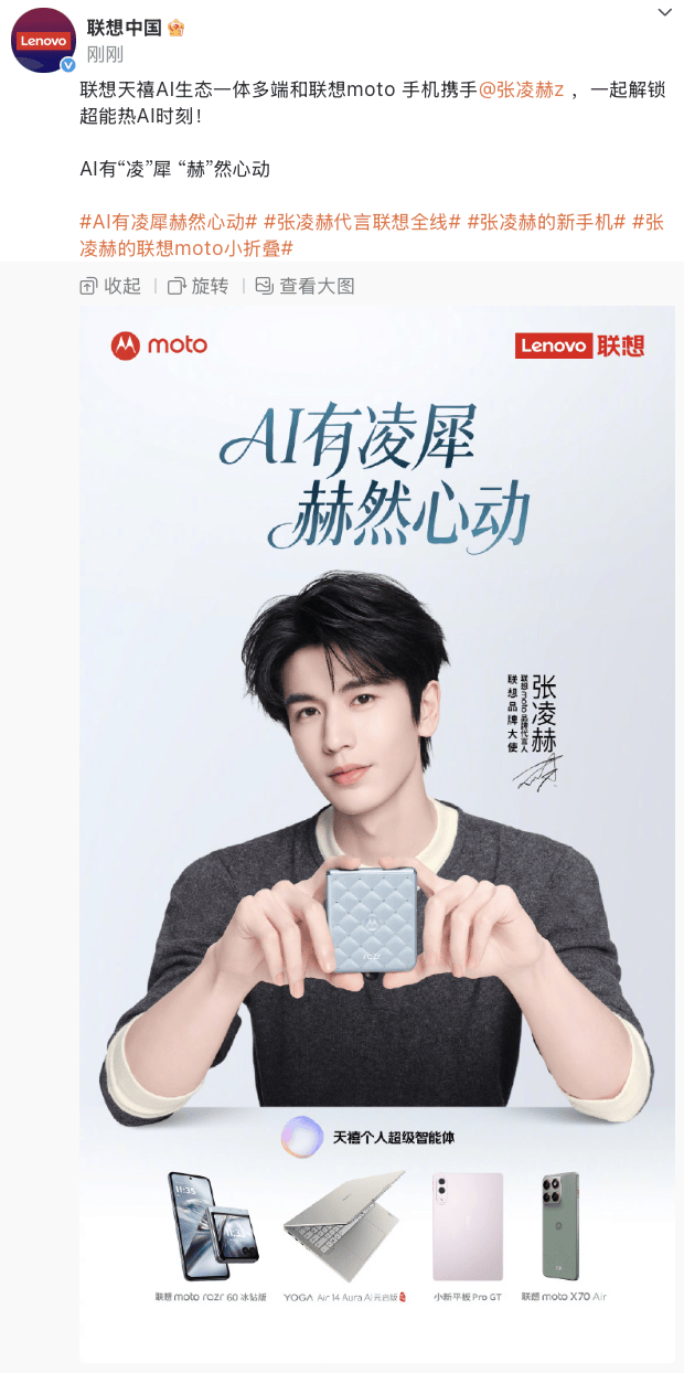 这张官宣海报上依次展示了天禧个人超级智能体和四款明星产品,联想moto razr 60冰钻版、YOGA Air 14 Aura AI元启版、小新平板Pro GT和还未上市的联想moto X70 Air。联想携手张凌赫以“AI有凌犀”体验,诠释“赫然心动”新境,将联想“一体多端”生动呈现。