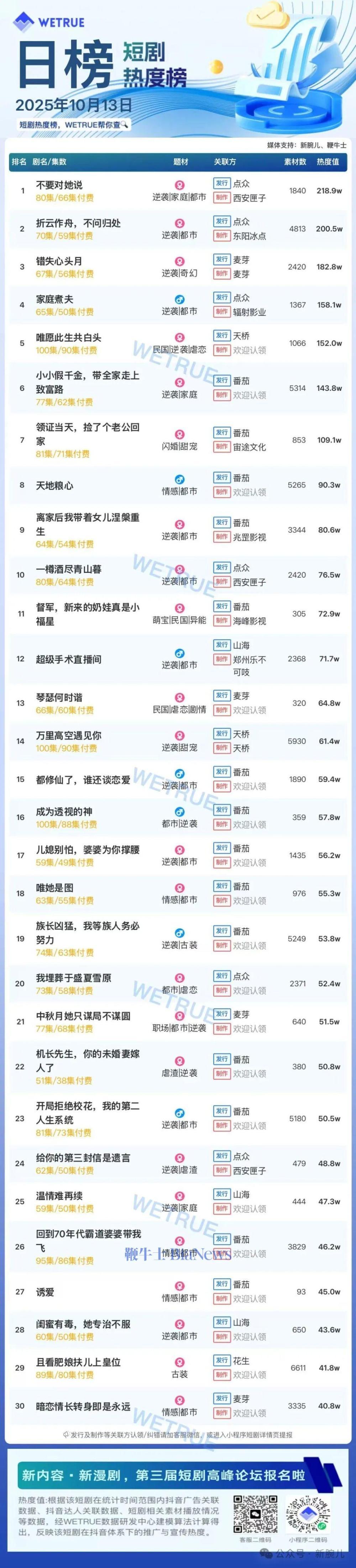 1、本日榜为WETRUE短剧数据公司提供,新腕儿和鞭牛士提供联合支持。