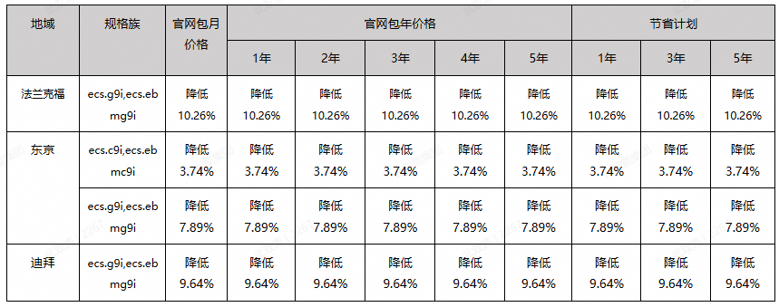 根据公告,此次调价产品的规格族包括ecs.c9i、ecs.g9i、ecs.r9i、ecs.ebmc9i、ecs.ebmg9i、ecs.ebmr9i,阿里云对相应产品的包月价、包年价格及节省计划进行了普降,以ecs.g9i产品为例,该产品在法兰克福降价10.26%,在东京降价7.89%,迪拜降价9.64%。