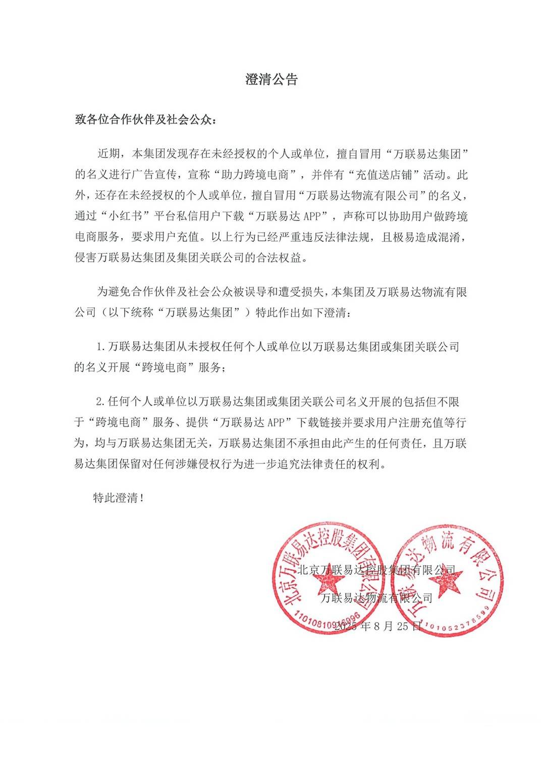 万联易达相关负责人向记者表示,为避免企业合作伙伴及社会公众被误导和遭受损失,万联易达集团已早于2025年8月25日向全社会发布澄清公告。公告表示,万联易达集团从未授权任何个人或单位以万联易达集团或集团关联公司的名义开展“跨境电商”服务。