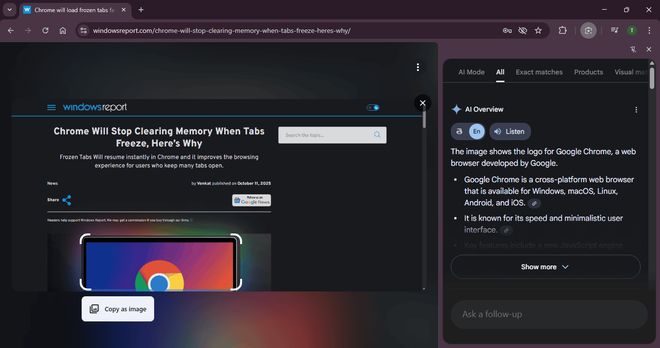 10 月 14 日消息,据科技媒体 Windows Report 今天报道,谷歌现已为 Chrome 浏览器的侧边栏功能新增 AI 模式,可让用户在使用 Google Lens 搜索图片时向 AI 提问题。