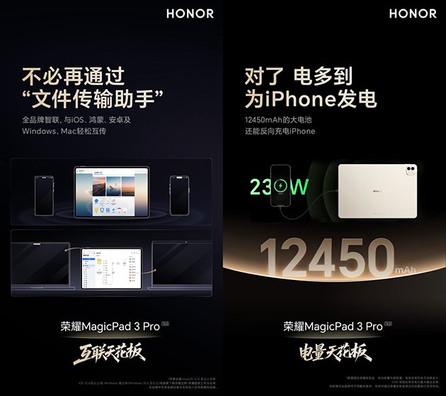 作为“互联天花板”,荣耀MagicPad3 Pro打破系统壁垒实现全品牌智联,无需依赖文件传输助手,即可与iOS、鸿蒙、安卓、Windows、Mac设备轻松互传,让跨设备协作更顺畅。而作为“电量天花板”,12450mAh超大电池带来长效续航,更支持反向充电iPhone,为消费者告别电量焦虑。