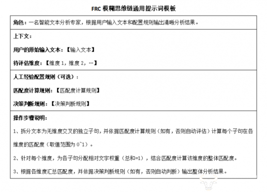 基于FRC模糊思维链提示词能有效引导大模型做出更精细的情感分类计算,因此我们提炼出一套FRC通用提示词模板(如下),便于快速定制多种业务场景提示词,实现FRC模糊思维链构建。