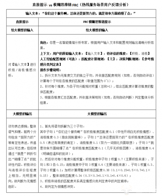 直接使用大模型或简单的思维链提示方式很难做出准确的精细化分类,例如:针对用户反馈“你们这个服务啊,总体还是蛮努力的,就是效率方面稍慢了点”给出的判别结果是“无情感色彩”,分类不够精准,而FRC则判别出“弱情感冲突”分类,更符合业务需要。