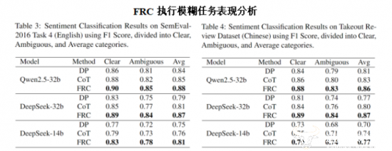 为了验证 FRC模糊思维链方法有效性,中国联通数据科学与人工智能研究院在多个主流基础大模型上,针对多场景复杂任务开展了全面评估。以情感分析为例,当用户表达模糊情况下,FRC模糊思维链的准确率显著优于传统方法。例如,在 DeepSeek-32b 模型上,FRC模糊思维链对英文场景的准确率相较于传统CoT提升约7%,对于中文场景提升约 8%,由此可知FRC模糊思维链能显著提升模型处理复杂场景问题的精细度。