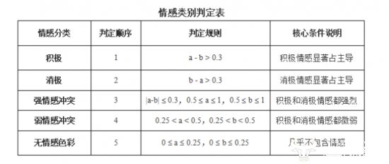 (注:设定a = 积极情感匹配度,b = 消极情感匹配度,a, bϵ[0, 1]。据人工经验显示,|a-b| > 0.3时,大模型容易判定情感分类为积极or消极。而当|a-b| ≤ 0.3 时大模型则难辨情感倾向,会统一判别为中立。因此|a-b|≤ 0.3 的阈值进一步细分为三类:以0.5、0.25为界,区分强冲突、弱冲突和无情感色彩。)