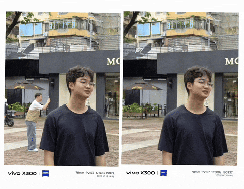 另外针对时下最流行的 Live Photo,vivo 还带来了一项新的玩法。除了可以套用相机的美颜管线、避免封面图和视频相差过大之外,X300 Pro 还首发了针对 Live Photo 的 AI 消除,哪怕是全程出镜的路人也可以直接消除了: