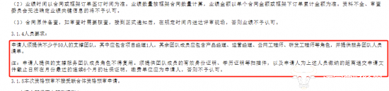 具体来看,该项目要求投标人须提供不少于50人的支撑团队,其中应包含项目经理1人,其余团队成员应包含产品经理、运营经理、云网工程师、研发工程师等角色,而且提供的支撑服务团队成员角色不得复用。