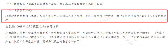 值得一提的是,项目否决投标情况显示,软通动力因团队人员变更后,不符合资格预审文件中的有关要求被否决。