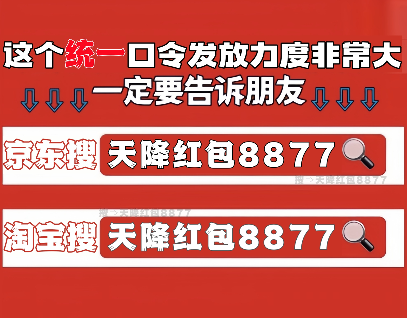划重点!今年天猫/淘宝和京东最新的双十一统一红包口令都是「天降红包8877」一定要记住!领的红包大小和你搜索的什么口令有关的!“天降红包8877”这个双平台唯一红包口令包领到大的!记得每天去领!