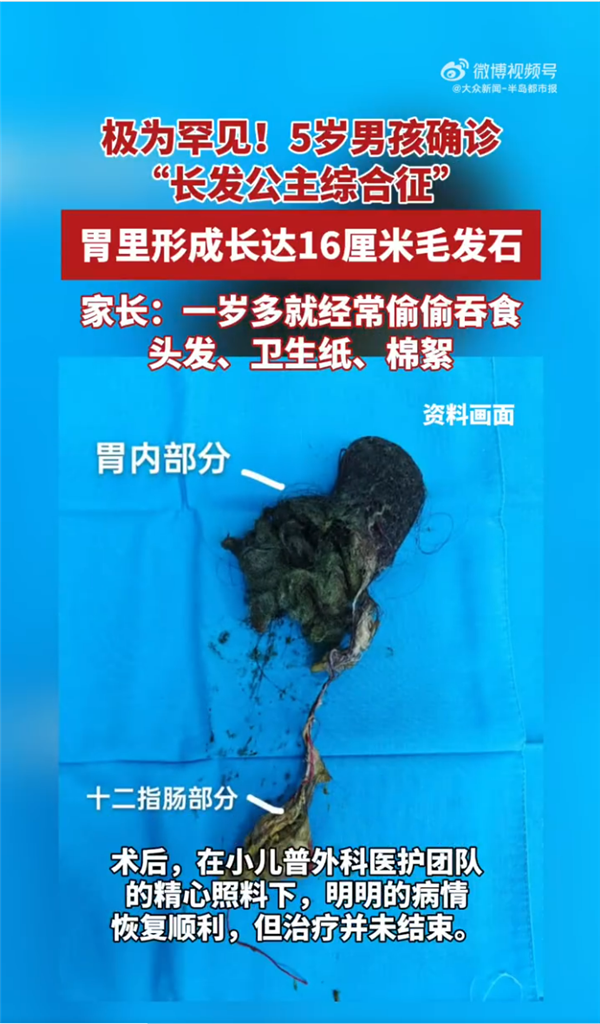 据了解,长发公主综合征是异食癖罕见类型,患者常常因焦虑和痛苦,表现出无法克制的反复拔毛和吞食非食物物质的行为。