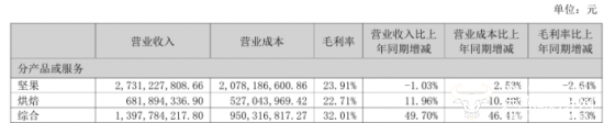 而今年上半年,三只松鼠营业收入为54.78亿元,同比上升7.94%,归母净利润为1.38亿元,同比大幅下降52.22%,呈现增收不增利的情形。其中,核心业务坚果类产品收入为27.31亿元,同比下降1.03%,是今年上半年公司主营业务中营收唯一下降的品类。