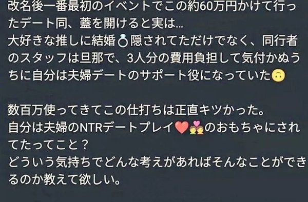 以下那位粉丝的自述,“那一场活动花费大约60万日元,在约会的同时我看到的真相却是...我最爱的偶像不仅仅隐瞒了婚姻,陪同她的工作人员也是她的丈夫,最后由我承担了三人的费用,在不知不觉中,我支持了他们夫妻俩的约会。说实话花了几百万日元,却受到了如此对待真的太难受了。也就是说我成了她跟她老公玩NTR约会play的梗了吗?到底是出于怎样的心情、感受以及想法才能做出这样子的事情啊!”