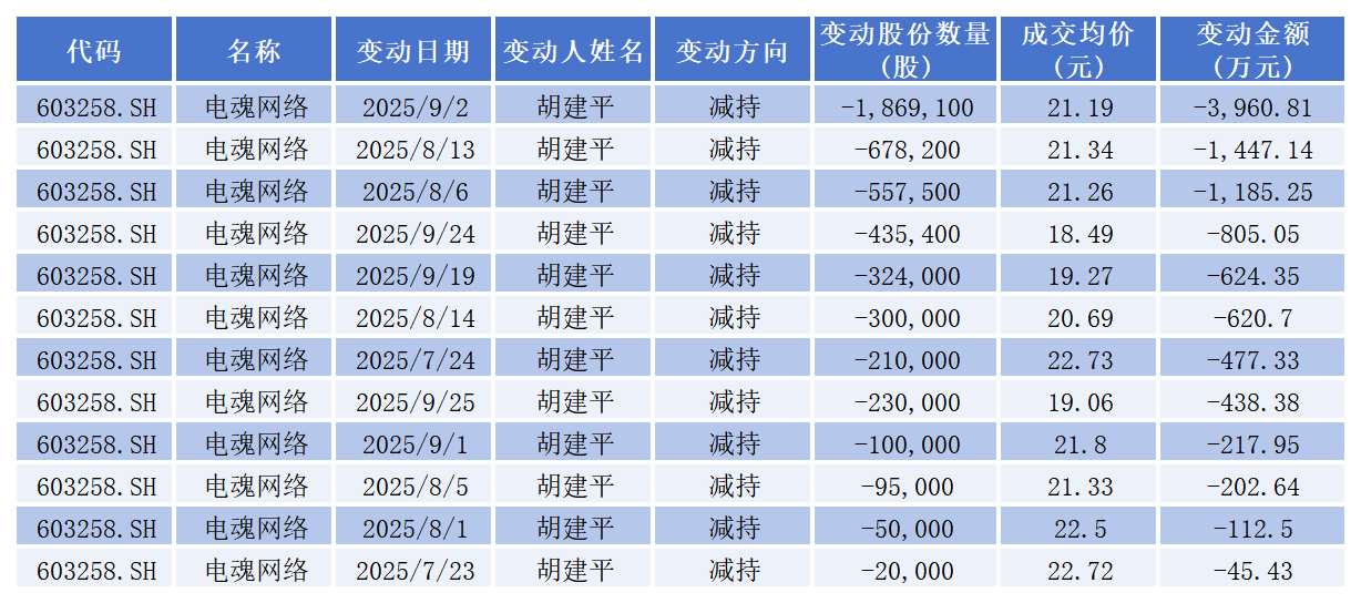 近日,电魂网络(603258.SH)发布公司公告,实际控制人、董事长胡建平已于7月至10月间完成减持486.92万股,套现1.01亿元,减持价格区间18.49-22.73元/股。截至10月10日收盘,电魂网络报20.72元/股,总市值50.56亿元。