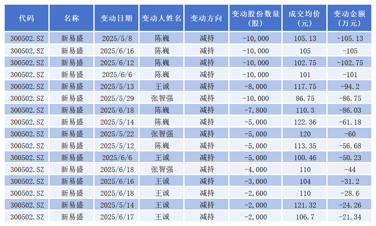 值得关注的是,公司其他高管今年也进行过一次集中减持。今年4月,新易盛公告披露,因个人资金需求,公司副总经理陈巍,副总经理、董事会秘书王诚以及监事张智强计划在三个月内合计减持不超过8.1万股公司股份。减持期届满,陈巍减持金额为617.77万元,王诚减持金额为249.84万元,张智强减持金额为190.74万元。