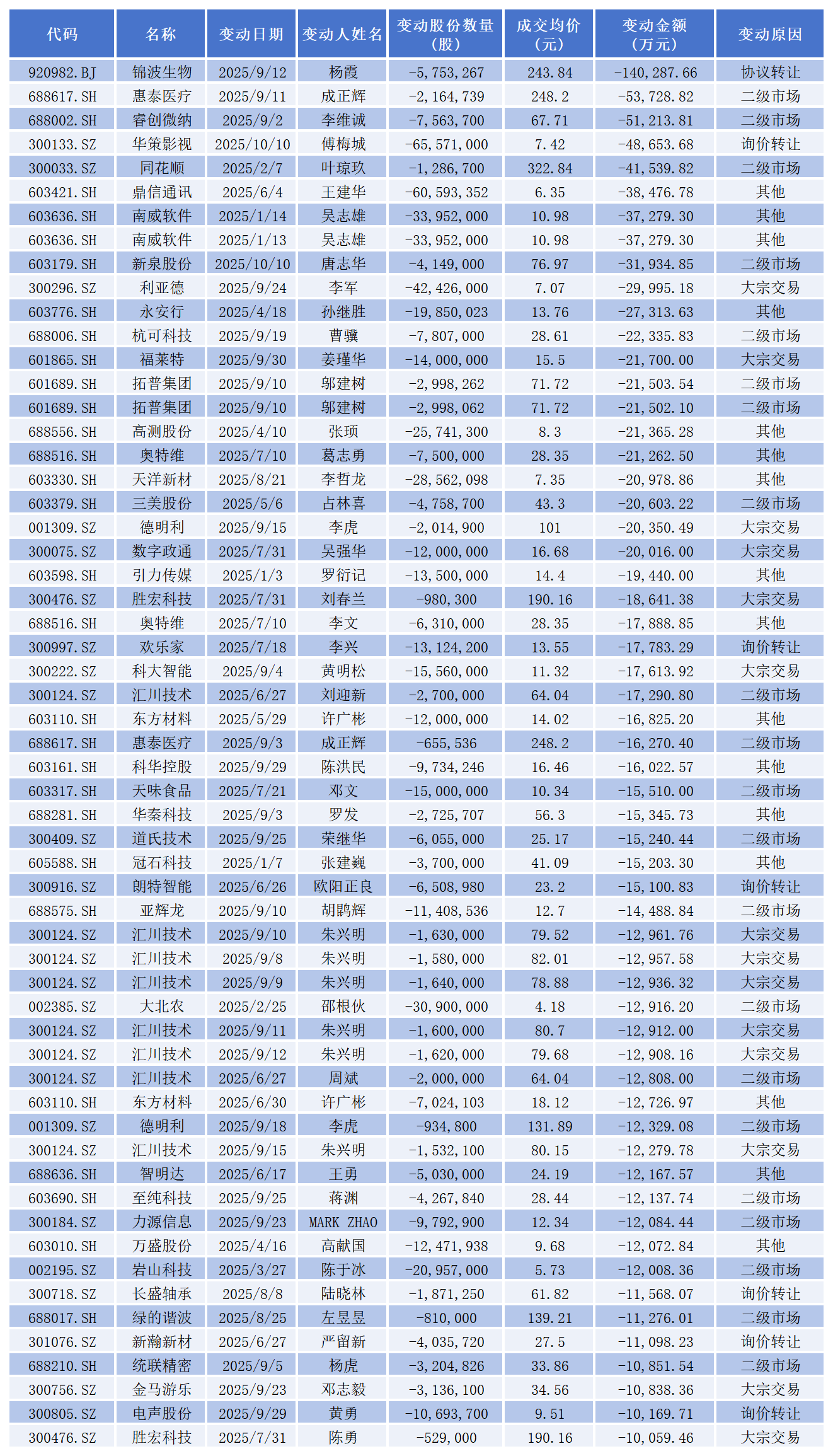 从减持次数看,江南奕帆(301023.SZ)两位董事陈渊技、龚建芬减持次数分别高达38、32次,博拓生物(688767.SH)高红梅减持次数高达32次,爱克股份(300889.SZ)张锋斌减持次数达到31次。
