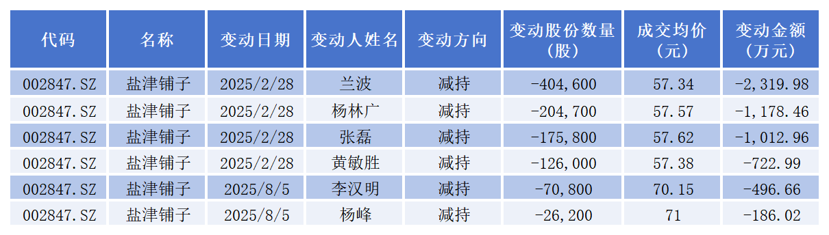 值得关注的是,公司高管层年内已多次“组团”减持,盐津铺子四位副总经理兰波、杨林广、黄敏胜、张磊曾“组团”抛出减持计划,公司副总经理李汉明和财务总监杨峰也加入减持大军。