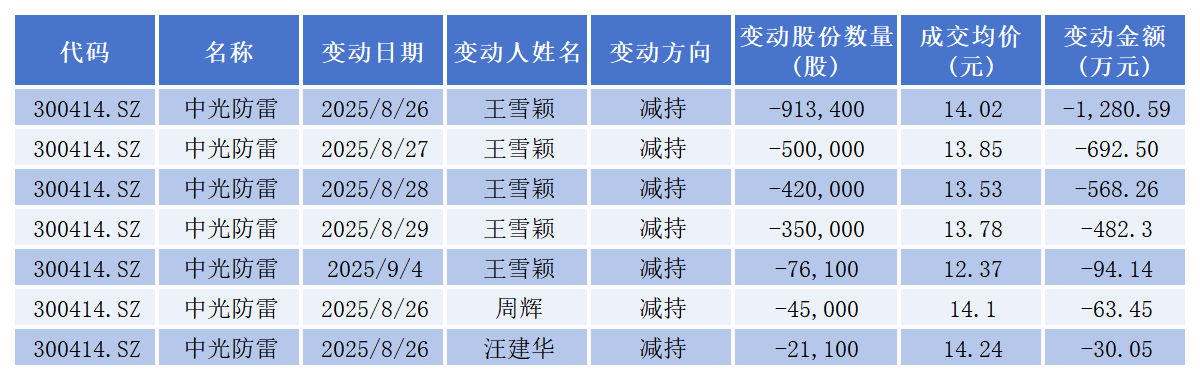 8月1日晚间,中光防雷(300414.SZ)公告称,公司董事长、总经理王雪颖计划减持不超过390万股,占公司总股本的1.1962%;董事、副总经理、董秘周辉计划减持不超过4.5万股,占公司总股本的0.0138%;董事、财务总监汪建华计划减持不超过3.8万股,占公司总股本的0.0117%。上述三名高管拟合计减持股份不超过中光防雷总股本的1.22%。减持时间为公告披露之日起15个交易日后的3个月内,减持方式包括集中竞价或大宗交易。