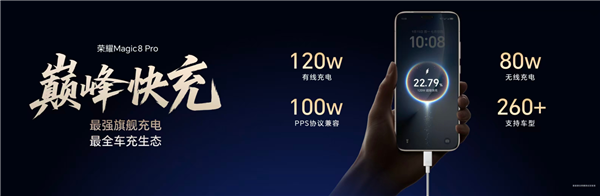 在充电方面,荣耀Magic8系列支持120W有线快充、80W无线快充,兼容100W PPS协议,支持超过260家的车充生态。