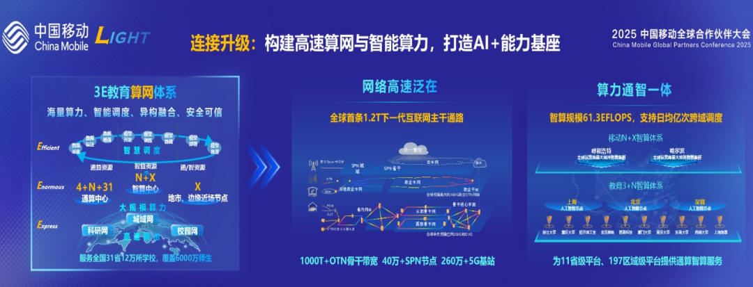 据了解,早在2006年,中国移动便通过村村通覆盖20万所学校,将“三通两平台”落地15省50地市。近几年,其表现更加突出,与教育部携手完成众多重大项目签约以及重要保障任务,独家支撑建设全球最大的教育资源中心——国家智慧教育平台;独家为AI试验场提供近千卡297PFLOPS国产化智能算力;独家联合教育部发布国家资源普惠计划;唯一运营商建立教育部—中国移动科研基金,累计投入4.5亿……