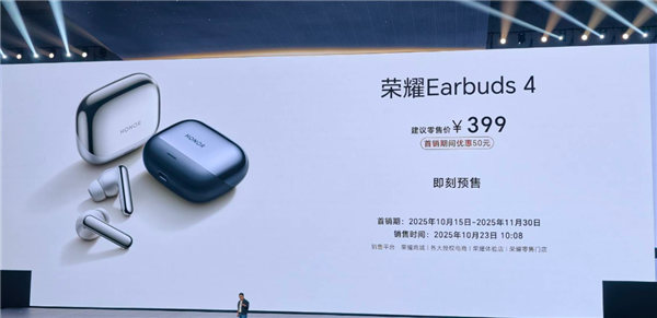 快科技10月15日消息,荣耀Earbuds 4今晚正式发布,售价399元,首销期间优惠50元。