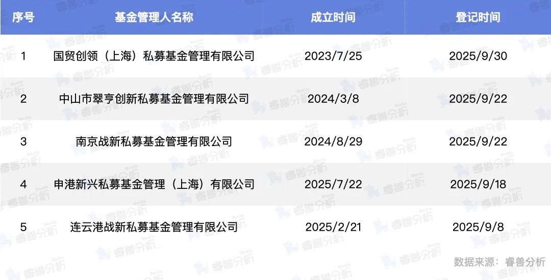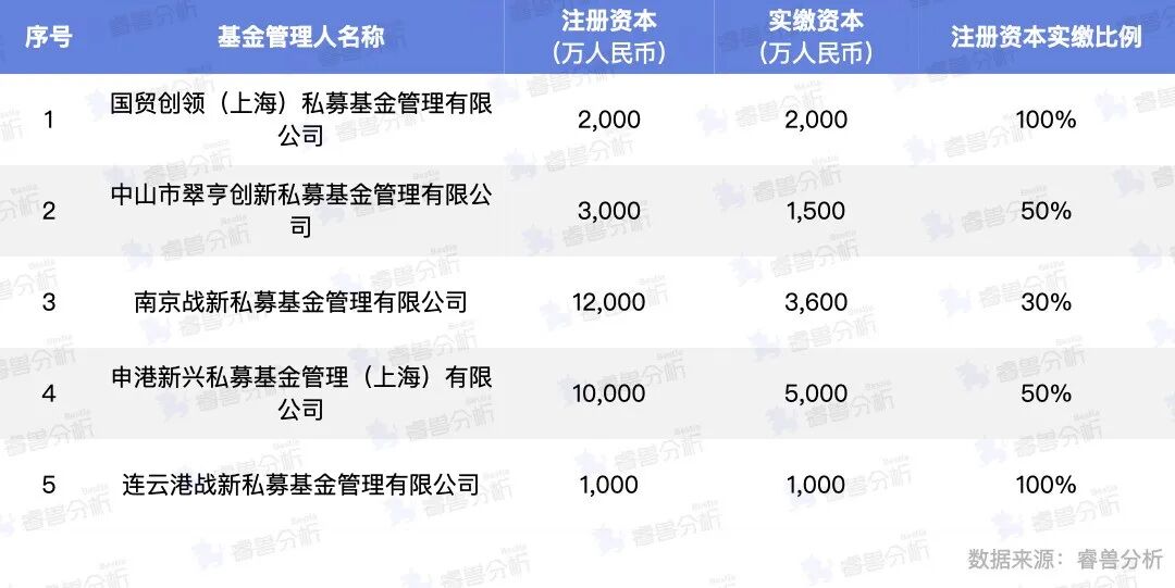 2025年9月,新登记的5家私募基金管理人中,仅2家私募基金管理人的注册资本实缴比例为100%;剩余3家中,南京战新实缴比例较低,为30%。