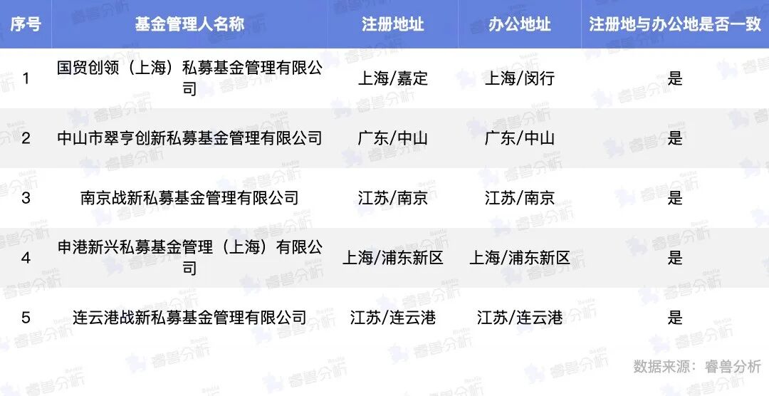 从办公地址看,5家机构注册地与办公地均位于同一地区。