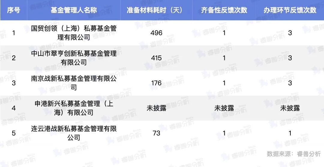 根据已披露的信息,9月新登记的基金管理人中,办理最快的是连云港战新,仅用时73天;办理最慢的是国贸创领私募,用时496天。经统计,机构平均准备材料耗时290天、平均齐备性反馈次数为1次、平均办理环节反馈次数为2.5次。