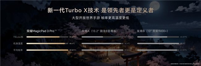 为了实现极致性能释放,荣耀MagicPad3 Pro搭载13层冰封散热系统,导热能力提升26%,并集成新一代Turbo X技术,《鸣潮》游戏帧率与控温表现均领先友商同级机型,《原神》可稳定运行120帧+2.6K分辨率的高画质设置,超分超帧表现达到业界超强。荣耀还联合高通业界首发PC级Q-Sync技术,对齐屏幕刷新率与游戏帧率,丝滑显示无惧延迟撕裂,让玩家看得爽,操控更爽。