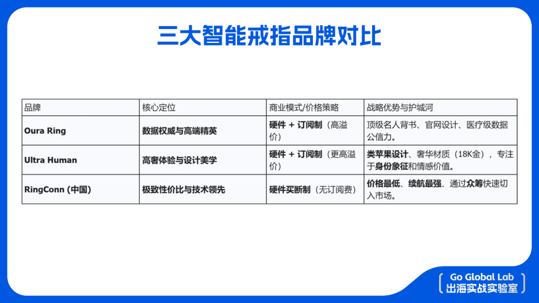 竞争策略: 设计上模仿Oura(如黑色设计、蓝色按钮),但在高溢价上更进一步。