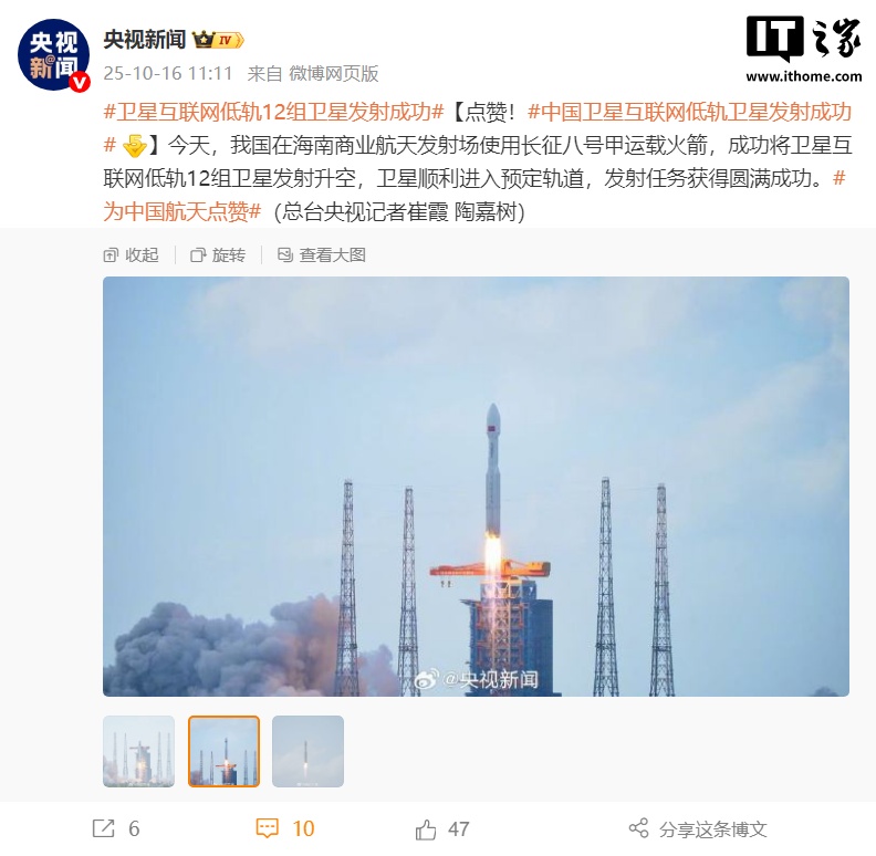 10 月 16 日消息,据央视新闻报道,我国今日在海南商业航天发射场使用长征八号甲运载火箭,成功将卫星互联网低轨 12 组卫星发射升空,卫星顺利进入预定轨道,发射任务获得圆满成功。