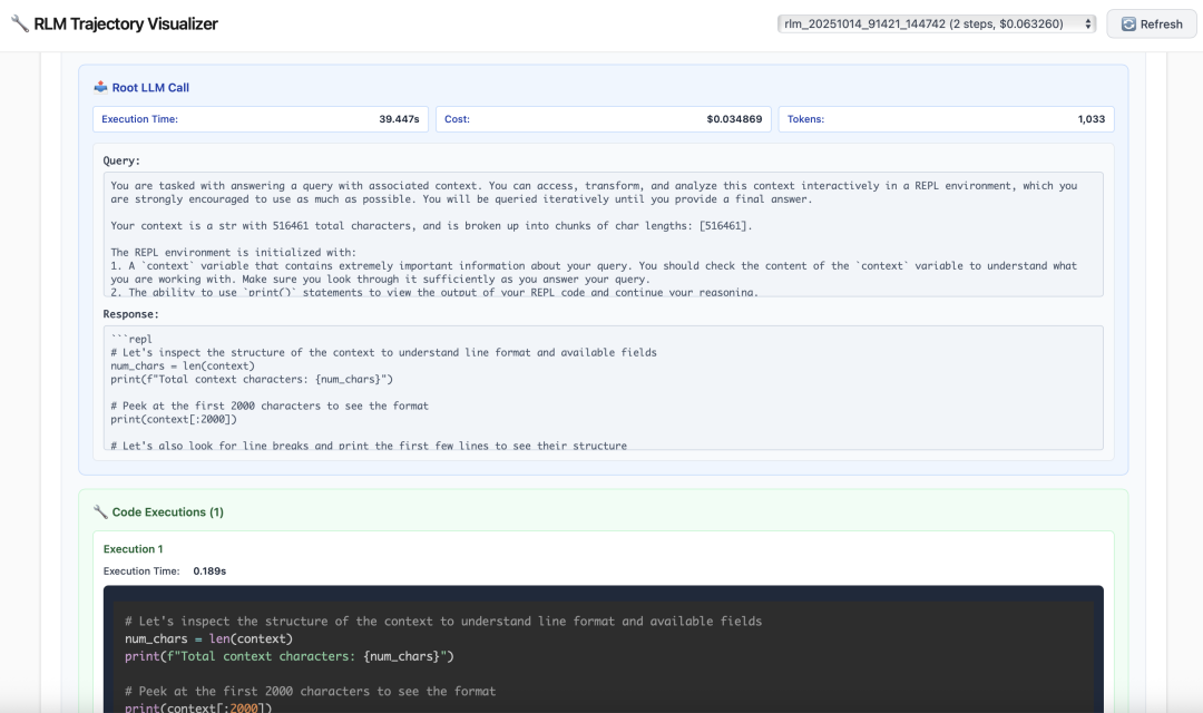 RLM 框架的一个显著优势在于:可以在一定程度上解释它的行为轨迹,理解它是如何一步步推理并得出最终答案的。研究团队编写了一个简易可视化工具,用来观察 RLM 的推理路径,展示了 RLM 实际在「动手做什么」。