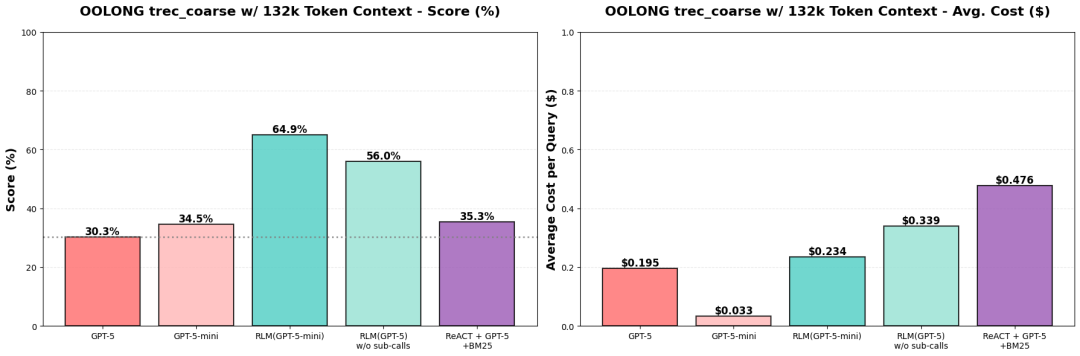 结果很惊人:在能获取到的最难的长上下文评测集之一 OOLONG 上,使用 GPT-5-mini 的 RLM 正确答案数量是直接使用 GPT-5 的两倍以上,而且平均每次调用的成本更低。