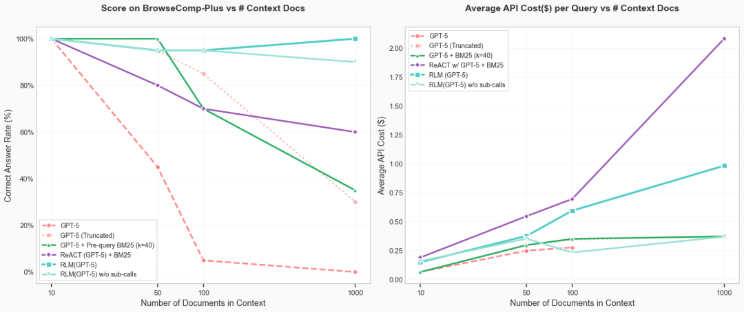 研究者在 BrowseComp-Plus 上对 20 个随机查询绘制了各种方法的性能和每个答案的 API 成本,随着上下文文档数量的增加。只有迭代方法(RLM、ReAct)在 100 篇文档以上时仍保持合理性能。
