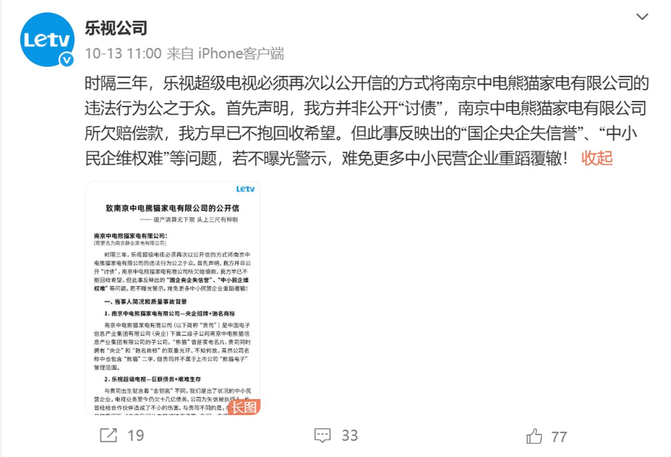 信中,乐视电视以千字长文控诉南京中电熊猫家电有限公司(现名南京静业家电有限公司)拖欠1495万元赔偿款,并痛斥其通过更名、申请破产等手段逃避债务,让胜诉后的乐视陷入“赢了官司却拿不到钱”的困境。