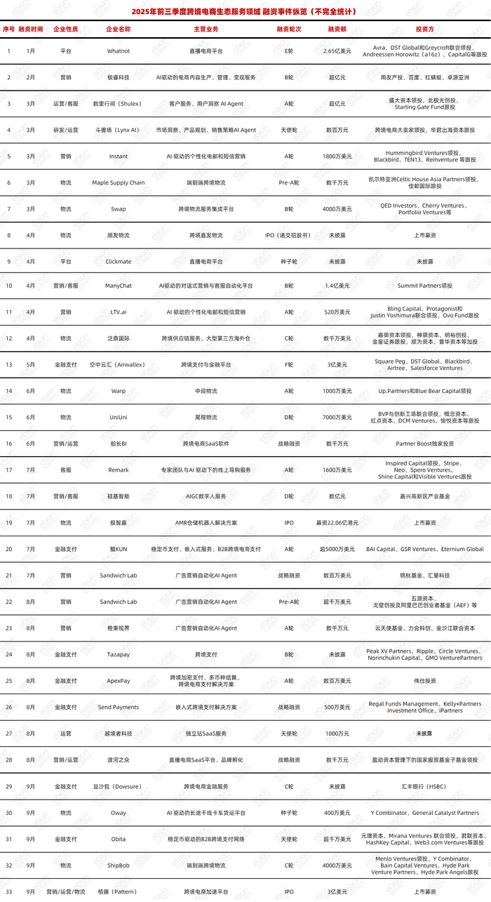 除了支撑起跨境电商生态的“双核”——营销与物流之外,电商运营与金融支付这两大赛道,在2025年同样吸引了资本的目光。