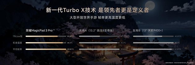 为了实现极致性能释放,荣耀MagicPad3 Pro搭载13层冰封散热系统,导热能力提升26%,并集成新一代Turbo X技术,《鸣潮》游戏帧率与控温表现均领先友商同级机型,《原神》可稳定运行120帧+2.6K分辨率的高画质设置,超分超帧表现达到业界超强。荣耀还联合高通业界首发PC级Q-Sync技术,对齐屏幕刷新率与游戏帧率,丝滑显示无惧延迟撕裂,让玩家看得爽,操控更爽。