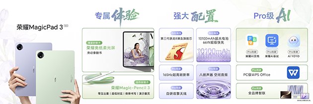 荣耀还推出了兼具轻薄高颜值的全新荣耀MagicPad3 12.5,并新增“放青松”、“好运紫”两款潮流配色,以及类纸柔光屏版本。荣耀MagicPad3 12.5搭载荣耀MagicPad3 Pro同款的165Hz高刷屏、PC级WPS Office以及Pro级AI体验。好轻、好看、好AI的荣耀MagicPad3 12.5,现已正式开售,消费者可于线上线下渠道选购。