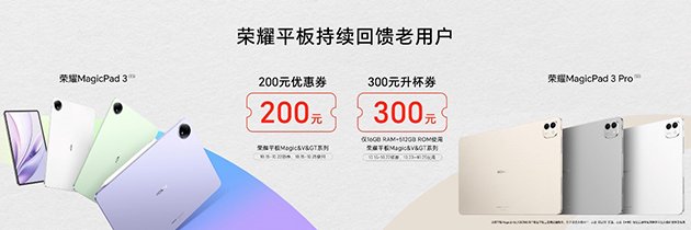 荣耀还公布了一系列持续回馈老用户的福利:购买荣耀MagicPad3 Pro最高配置可享300元升杯券;即刻起,将在多款平板机型中陆续升级MagicOS 10与PC级WPS功能。另外,2021年4月后发布的荣耀PC全系也将获得YOYO助理升级推送,双11期间购买荣耀笔记本,更有叠加国补最高省3000元的优惠福利。