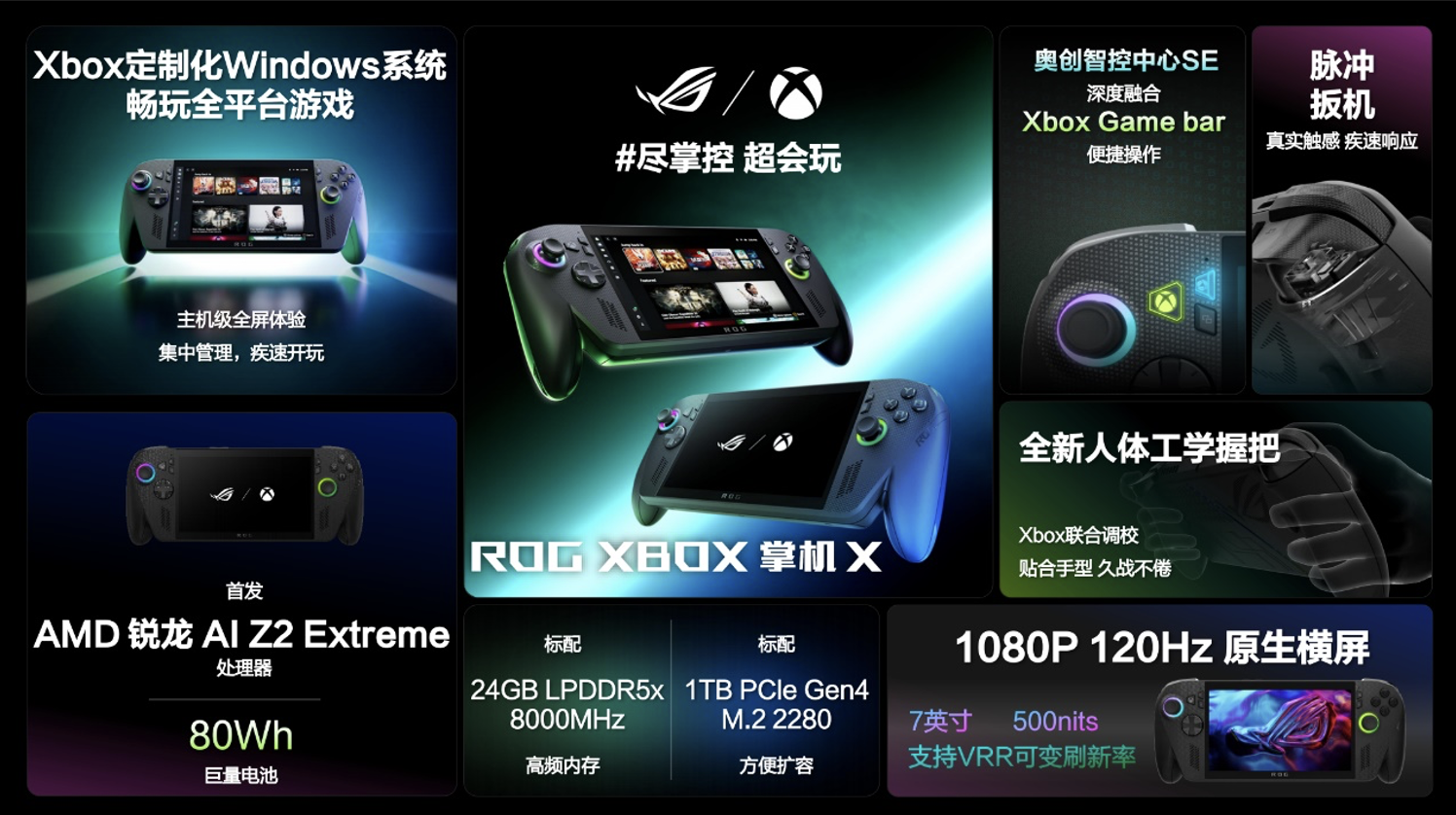作为ROG与微软XBOX团队深度联合的首款掌机,ROG Xbox掌机 X在硬件与系统层面实现多项创新:搭载Xbox定制化系统与全屏沉浸体验界面,配备全新人机工学握把设计,带来更具“主机味”的掌机操作体验。新品首发搭载AMD锐龙AI Z2 Extreme处理器,配备7英寸1080P 120Hz原生横屏与80Wh大电池,性能、续航与操控全面升级,定义掌上游戏新标准。