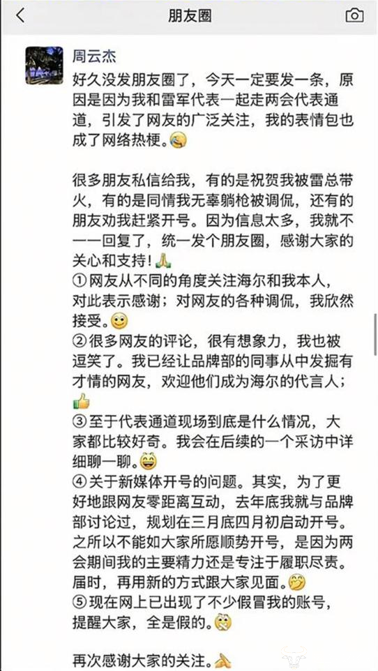 此外,周云杰在今年3月因一次公开活动中与小米董事长雷军的互动表情引发网络关注,其严肃神态与雷军的笑容形成鲜明对比,意外成为舆论焦点。对此,周云杰通过朋友圈回应,对网友的关注表示感谢。