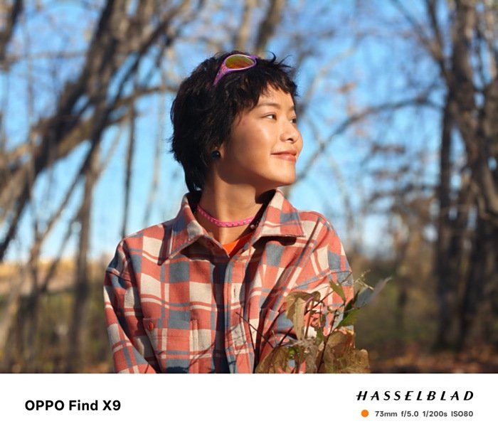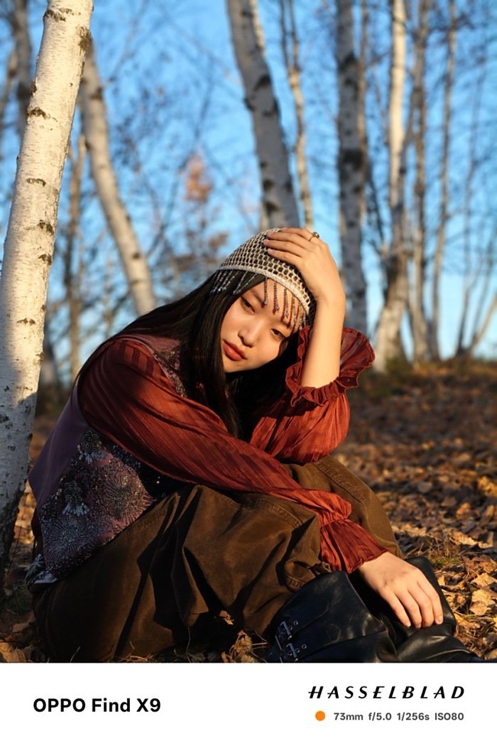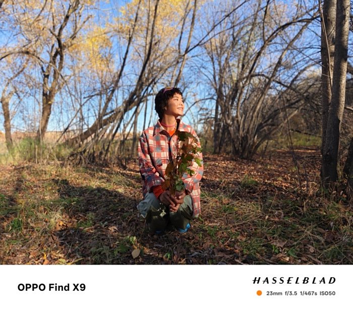 OPPO Find X9 的主摄在强光与阴影并存的环境下保留了良好的动态范围,在拍摄人物面部时,阴影层次细腻。HASSELBLAD 联合调校的色彩风格明显,肤色偏自然暖调,草地与树干的层次丰富,秋季氛围浓郁。