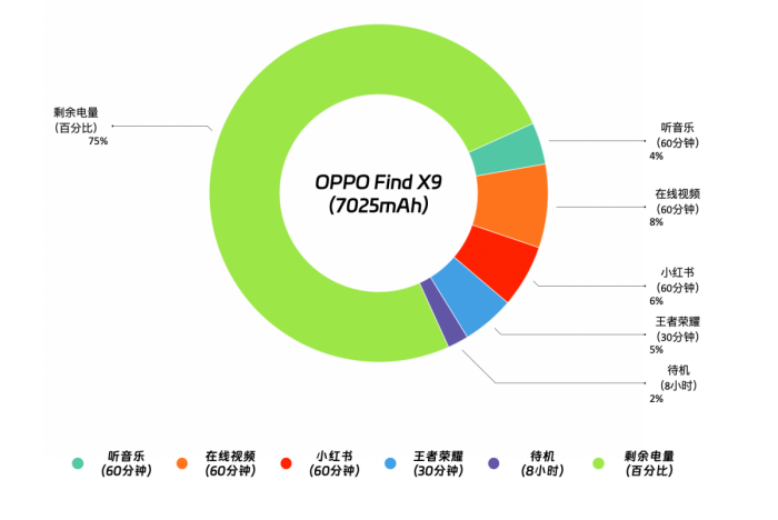 在续航方面,OPPO Find X9 配备新一代 7025mAh 冰川电池,采用 OPPO 自研第四代硅碳负极材料,大幅提升电池寿命。支持 80W 有线快充和 50W 无线快充。在室温条件下的 Wi-Fi 续航测试中,其表现如下: