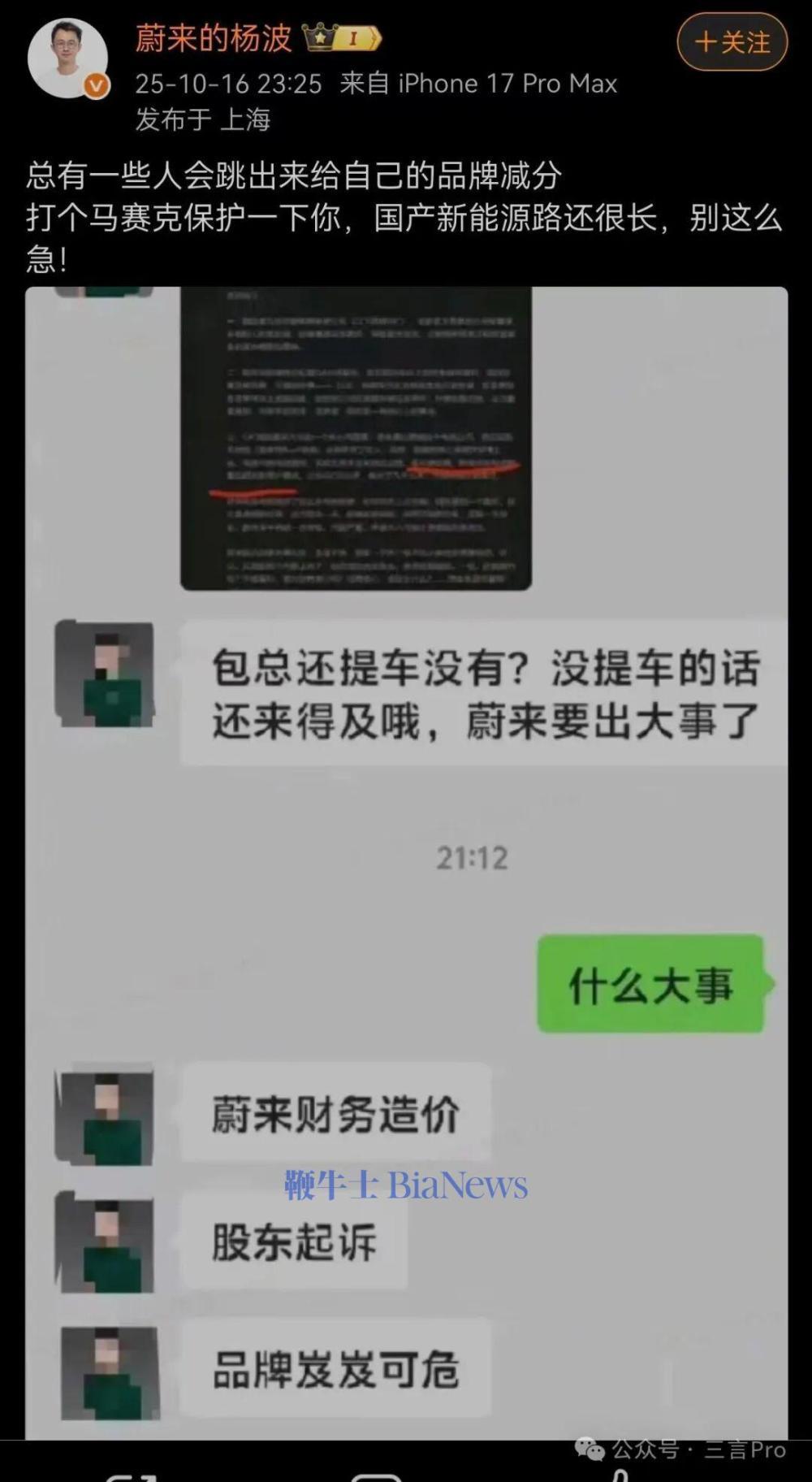 10月16日晚,蔚来用户运营负责人杨波在微博上转发该聊天记录并表示,总有一些人会跳出来给自己的品牌减分;他还表示“国产新能源路还很长,别这么急”。