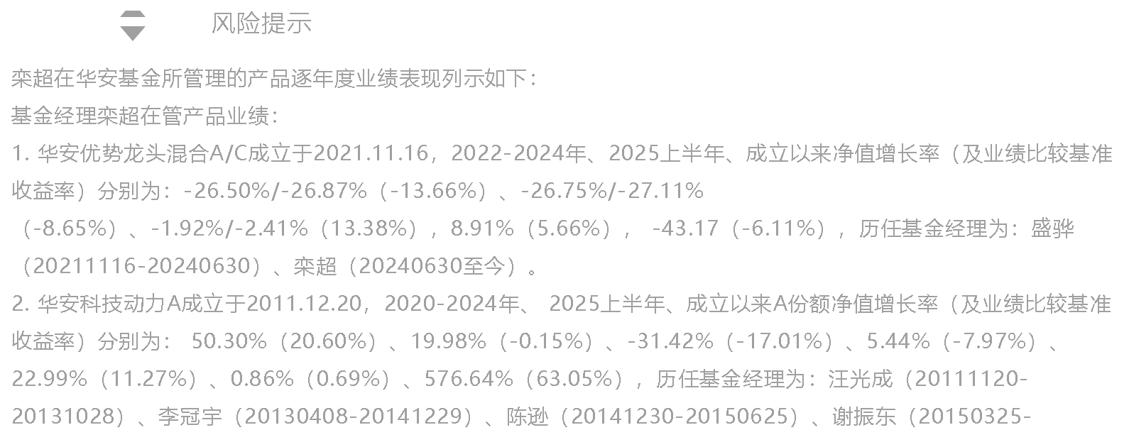 他从自2024/07/01开始管理华安优势龙头,产品近1年净值上涨58.61%,跑赢同期业绩比较基准、万得偏股混合基金指数的33.50%和48.60%,同类排名前1/3(1144/3795)。(数据来自:业绩来自基金定期报告,同类排名来自国泰海通证券基金评价中心,截至2025-08-31,同类标准指主动混合开放型—强股混合型。)