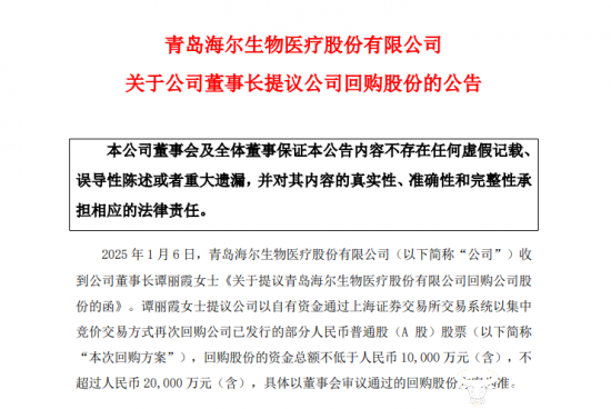 为稳定市场信心并完善长效激励机制,谭丽霞于2025年1月6日提议公司以自有资金通过集中竞价交易方式回购股份。随后,海尔生物在9月2日发布公告称,截至2025年8月31日,已累计回购股份237.62万股,占总股本的0.7474%。